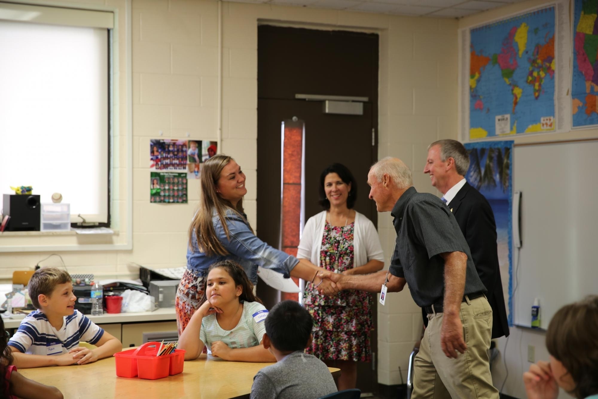 Dr. Kile introduces Mr. Beehler & Dr. Thacker to an Elm Road teacher