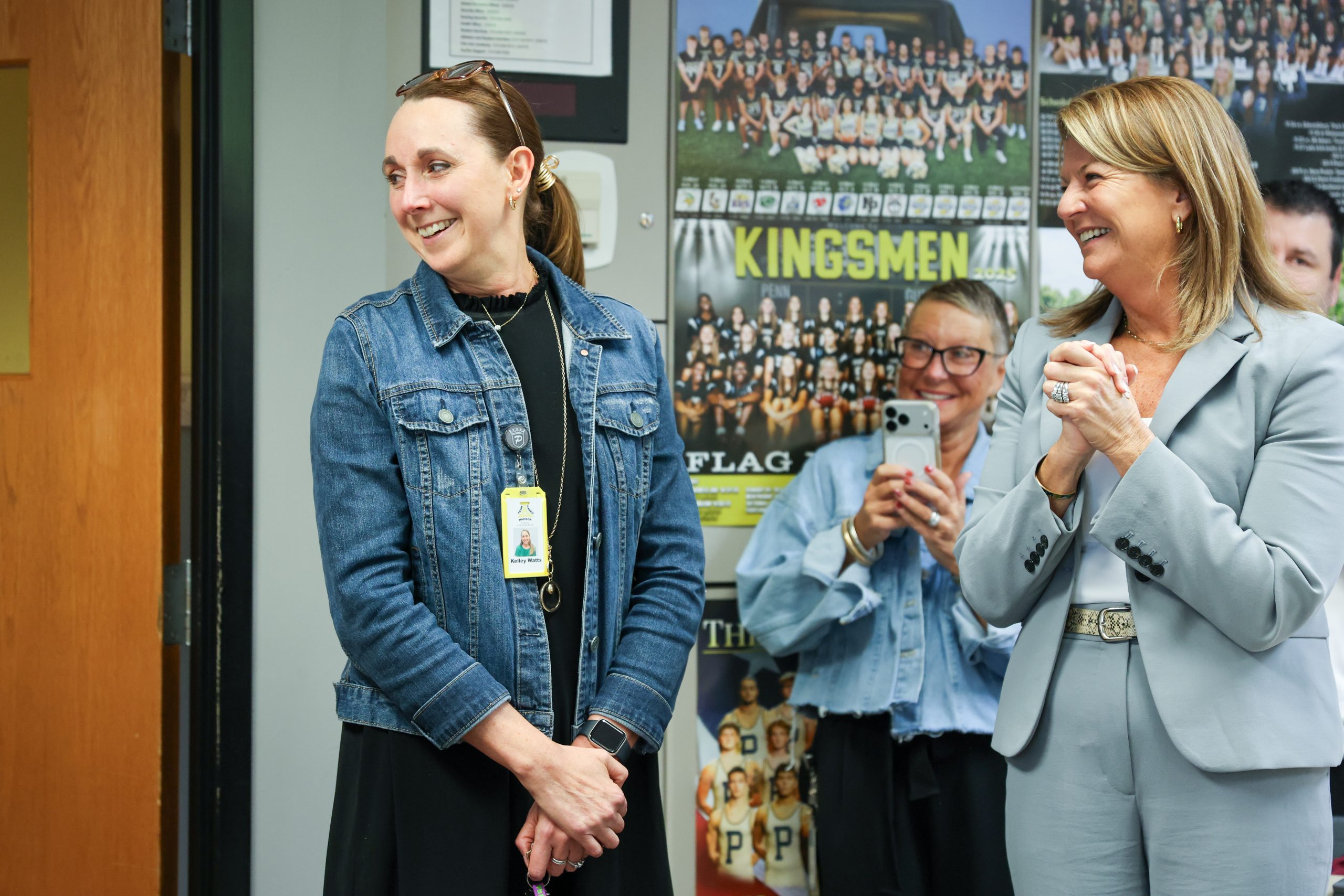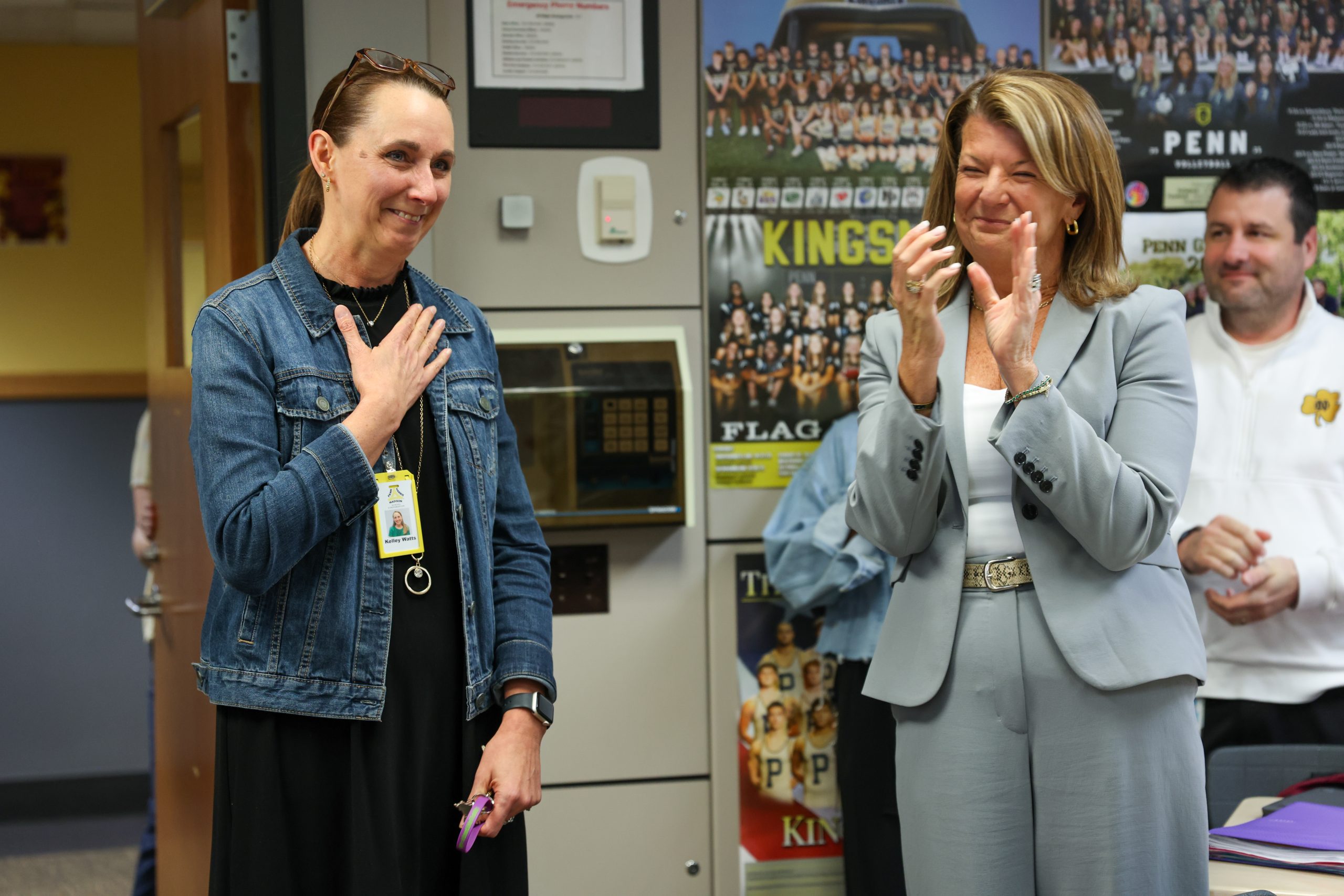 With some behind-the-scenes planning by Principal Rachel Fry and Associate Principal Jeanie Mitchell, Watts was called away from her classroom for what she thought was a photo opp with students in Penn’s Main Arena–on the other side of the building away from her classroom. While Watts was being kept busy, P-H-M Superintendent Dr. Heather Short, Assistant Superintendent Dr. Lavon Dean-Null, other P-H-M administrators, and local TV station news crews snuck into Watts’ classroom to get everything in place for the big surprise. Click to see the full photo gallery below.